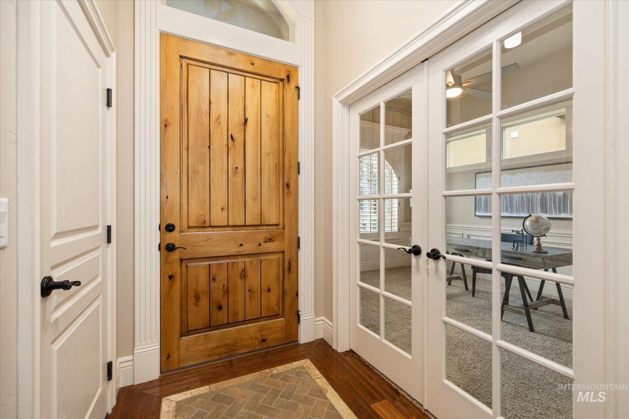 Luxury single-level home on the golf course in the Banbury Meadows community, originally custom built by the builder as his personal residence. Meticulously maintained, this exceptional home features high-end finishes throughout, including granite surfaces, knotty alder cabinetry, maple hardwood flooring, and elegant coffered ceilings that bring warmth and sophistication to every room. The open-concept design is ideal for both everyday living and entertaining, with a built-in entertainment center and a flexible third bedroom that functions perfectly as an office, den, or guest room. The spacious primary suite offers a tranquil retreat with a generous walk-in closet and private ensuite bath, while the second full bath features a relaxing steam shower for added comfort. Additional highlights include a finished garage with durable epoxy flooring, an integrated air purifier and humidifier, ample storage throughout the home, and a new HVAC system installed in 2023 for efficiency and year-round comfort. Minimal maintenance living is enhanced by the HOA, which takes care of landscaping, allowing homeowners to enjoy the beautifully maintained grounds without the work. Prime Eagle location where residents enjoy access to a Westover Lakes pool pass and just steps to the golf course.