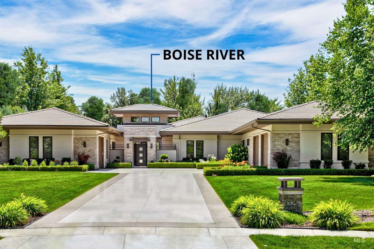 The opportunity to own a private Boise River home in one of Eagles most prestigious gated settings is exceptionally rare. This stunning residence in the Two Rivers neighborhood backs to the River and is protected by forever greenspace, creating a setting defined by serenity and natural beauty. Custom-designed for sophisticated living, the residence makes an immediate statement?clean architectural lines, a balanced façade, and a perfectly manicured landscape leading to a striking entry. Every inch of the property reflects thoughtful design, blending modern finishes with natural textures to create a home that feels both refined and inviting. Step inside to soaring ceilings, sleek tile flooring, and expansive windows that frame breathtaking views of the surrounding landscape. Natural light fills the open living spaces, while the thoughtfully designed layout creates an ideal environment for both relaxed daily living and effortless entertaining. The private primary suite serves as a peaceful retreat, featuring floor-to-ceiling windows and dedicated His & Hers full bathrooms. A beautifully appointed in-law suite/ADU offers a fully self-contained living space complete with a private entrance and attached garage bay - perfect for multi-generational living or hosting long-term guests. Wide hallways, doorways, and a great room anchored by a dramatic rock fireplace with high ceilings.