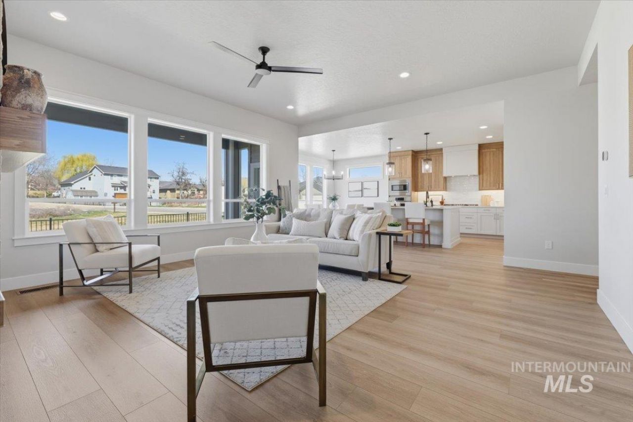 Single-level living in one of Middletons newest communities, offering upscale comfort paired with the charm of small-town Idaho. This thoughtfully designed 3 bedroom, 2.5 bath home features an open-concept layout ideal for both everyday living and entertaining. The spacious kitchen is the heart of the home, showcasing a generous island, built-in oven, gas stovetop, quartz countertops, and custom cabinetry that continues throughout the kitchen and bathrooms. The great room is bright and inviting, highlighted by a beautiful stone fireplace and seamless flow into the dining and kitchen areas. The private primary suite is a true retreat, featuring a luxurious bathroom with a relaxing soaker tub, walk-in shower, dual vanities, and a large walk-in closet. Situated on a desirable corner lot with common area behind the home, the backyard feels open and extended while offering added privacy with no direct rear neighbors. Enjoy quiet evenings under the covered patio, perfect for relaxing or entertaining. The community features a walking path that connects to nearby parks and is conveniently located close to shopping, dining, and access to the Boise River Greenbelt. A spacious 3-car garage and beautiful finishes throughout complete this exceptional home.