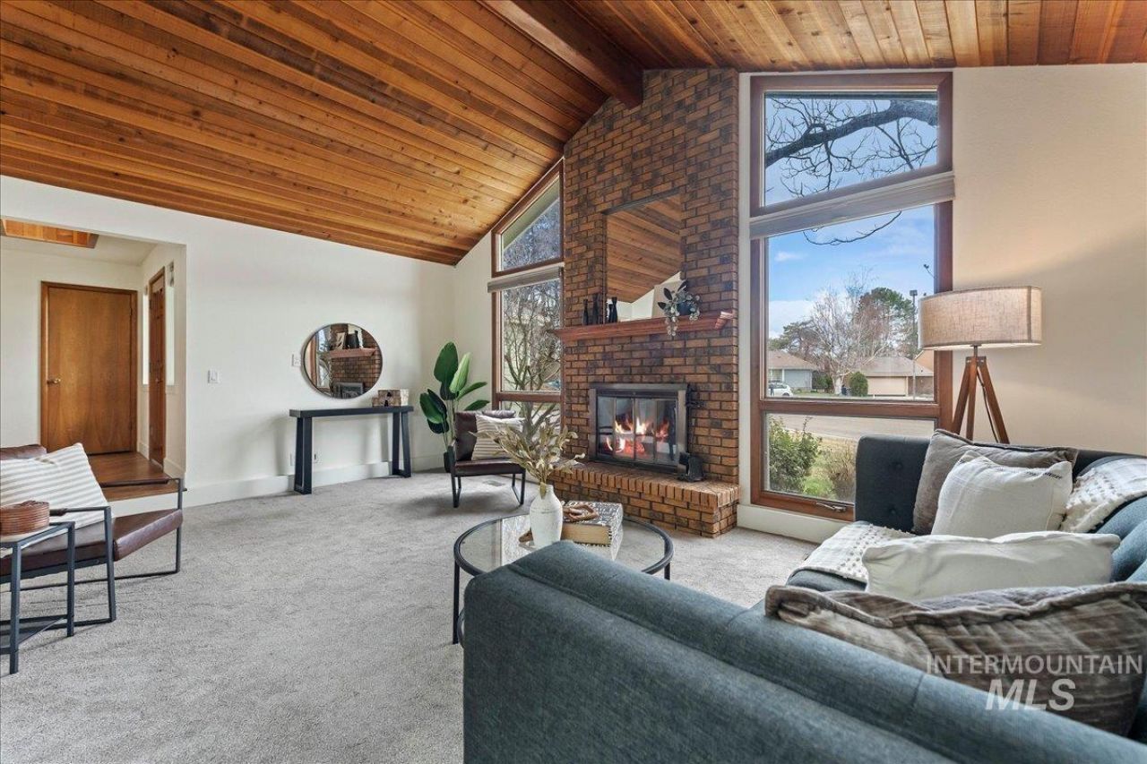 Showstopping beauty bursting with mid-century character and unforgettable architectural design! Step inside to soaring wood vaulted ceilings, rich wood trim, a dramatic staircase with copper railing, and iconic mid-century lighting that creates a warm yet striking first impression. The grand living room centers around a cozy wood-burning fireplace, while a second living space with its own gas fireplace offers flexibility for entertaining or relaxing evenings at home. Walls of windows flood the home with natural light and lead to two patios just off the main living area, seamlessly blending indoor and outdoor living. The updated kitchen shines with solid countertops, painted cabinetry, and stunning copper and rose-gold accents that elevate the entire space. The main-level primary suite offers a peaceful retreat with private outdoor access ideal for a future hot tub, walk-in closet, dual vanities, and a step-in shower with dual showerheads. Upstairs youll find an impressive loft overlooking the living space, abundant built-in storage, three spacious bedrooms, and a full bath. Tucked on a cul-de-sac in one of South Nampas most established neighborhoods featuring mature trees, expansive green space, scenic walking paths, a community pool, and tennis courts. Timeless charm, bold design, and incredible community living all in one unforgettable home!