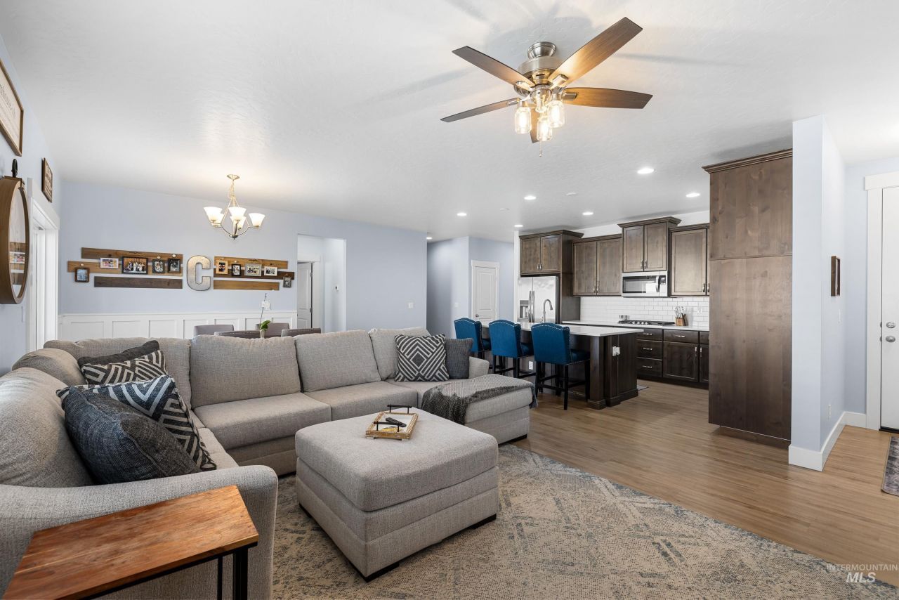 Discover refined living in the desirable Heirloom Ridge community, perfectly positioned in Star, ID, on the border of Eagle. This exceptional 1,586 sq. ft. single-level home offers 3 BR, 2 Bath, and a 2 CG ideal for comfortable, low-maintenance living. Open floor plan features an open great room, creating an airy and expansive feel. The heart of the home is a generous kitchen boasting abundant cabinetry and ample counter space, flowing seamlessly into the living and dining areas for easy everyday living and entertaining. Premium upgrades include LVP flooring throughout and elegant wainscoting finishes. Outside, you will find fully landscaped grounds, a relaxing back patio, and the privacy of having no rear neighbors. Heirloom Ridge offers resort-style amenities, including a large community pool, park, playground, and walking paths. The community is nestled among scenic farmland and rolling hills, providing a serene rural atmosphere with convenient access to Eagles shopping, dining, and recreation. Better than new and completely turn-key, this home is move-in ready. Do not miss this opportunity!