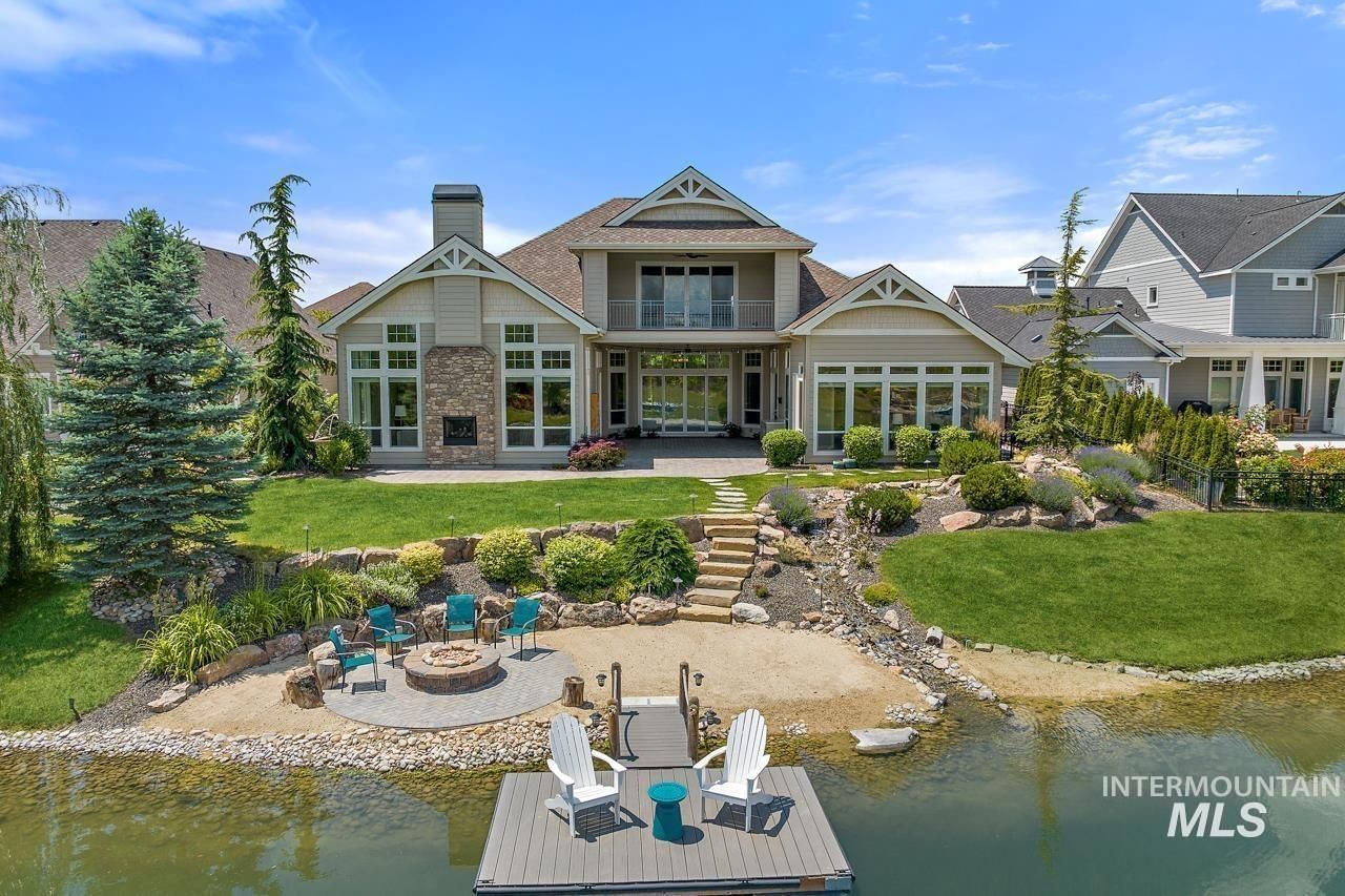 Exceptional waterfront living in the prestigious Legacy Lakeside Retreats with stunning lake and Bogus Basin views. Flexible floor plan offering 4 bedrooms, or 3 beds plus a dedicated office/flex space and spacious upstairs bonus room and 3.5 baths, and a 3-car garage with dedicated storage space. Soaring ceilings, expansive windows, and a dramatic double-sided stone fireplace frame the water views and fill the open-concept design with natural light. The chefs kitchen showcases quartz countertops, oversized island, walk-in pantry, prep sink, Thermador gas range, steam oven, and built-in dual-zone 92-bottle wine refrigerator. The private primary suite features a sitting retreat overlooking the fountain and pond, spa-inspired bath with soaking tub, dual vanities, walk-in shower, and generous closet. East-facing backyard designed for entertaining with courtyard patio, custom waterfall, fire pit, private dock, and sandy beach frontage. Enjoy resort-style living with HOA amenities including golf, walking trails, fishing, tennis, pickleball, and pools.